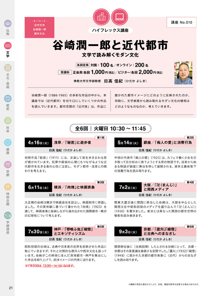 内容:谷崎潤一郎(1865-1965)の多彩な作品の中から、本講座では〈近代都市〉を切り口にしていくつかの作品を読んでいきます。都市空間の「近代性」は、作品に描かれた都市イメージにどのように反映されたのか、同時に、文学表現から読み取れるモダン文化の様相はどのようなものなのか、考えていきます。