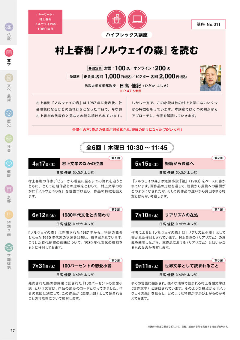 内容:村上春樹『ノルウェイの森』は1987年に発表後、社会現象になるほどの売れ行きとなった作品で、今なお村上春樹の代表作と見なされ読み続けられています。しかし一方で、この小説は他の村上文学にないいくつかの特徴をもっています。本講座では6つの視点からアプローチし、作品を読解していきます。