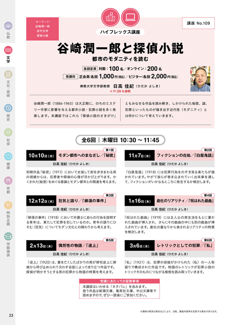 内容:谷崎潤一郎(1865-1965)は大正期に、のちのミステリー作家に影響を与える都市小説・犯罪小説を多く発表します。本講座ではこれら「探偵小説のさきがけ」ともみなせる作品を読み解き、しかけられた秘密、謎、犯罪といったものが描き出す近代性(モダニティ)とは何かについて考えていきます。